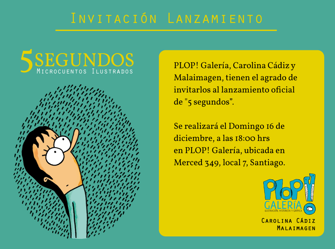 El día domingo 16 de diciembre se realizará el lanzamiento oficial de «5 segundos», libro de microcuentos ilustrados, realizado en conjunto entre @caropaz_ y malaimagen. Se trata de un libro de cuentos -escritos por Carolina- inspirados por la cotidianeidad, por mostrar realidades e identificar a las personas con experiencias o momentos. Contienen crítica social, historias de amor, desamor, y valoración por las cosas simples. Las ilustraciones de malaimagen -trabajadas con acuarela- pretenden darle calidez a la historia, y complementar la intención del relato.